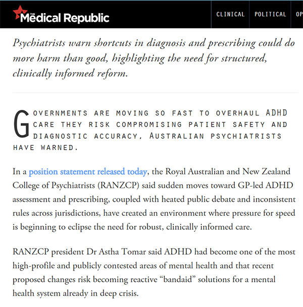The shift in the public discourse is clear: ADHD is now a mainstream health policy issue, and the media narrative increasingly reflects the evidence-based principles the RANZCP has championed.